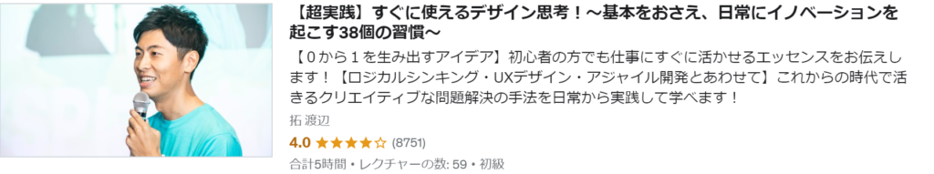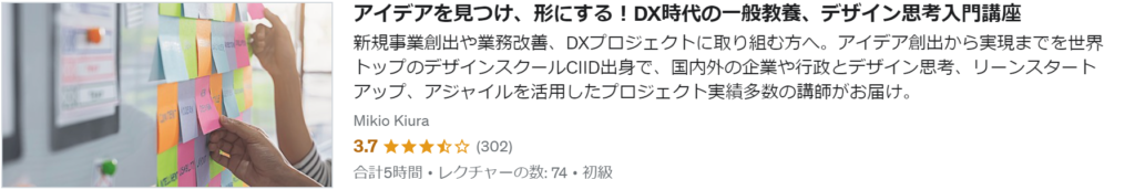 デザイン思考の基本的な考え方を理解でき、デザイン思考がトレンドになっている背景が分かります。”面白くて新しい”アイデアの発想法、様々なプロトタイプの方法、アジャイル的な企画の進め方、ユーザーニーズを捉えた企画の立て方(カスタマージャーニーマップの作り方)が学べるコースです。