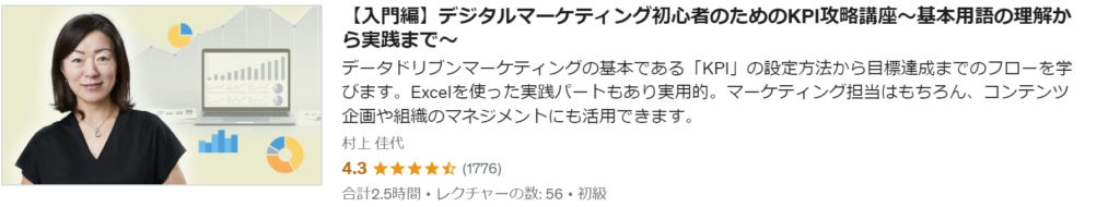 マーケティングでKPIとして使われる重要な10の指標を丁寧に説明し、マーケッターにとって必要不可欠なKPIの基礎と攻略法を理解することができます。また、データドリブンマーケティングとは何かを論理的・構造的に理解することができるコースです。