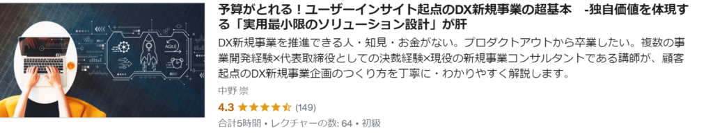 DX新規事業の企画を具体化していくプロセス・手順の理解、顧客課題・ユーザーインサイトを発見するための具体的な視点や考え方、DX新規事業企画の5W1H:WHY・WILL・WHEN・WHO・WHAT・HOW、ビジネスモデルの検討(ビジネスデザイン)の具体的な視点や考え方等が学べるコースです。