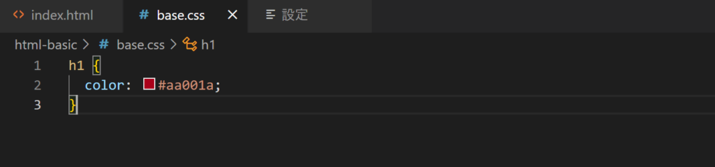 これはbase.cssという名前のCSSファイルですが、HTMLの10行目にある<h1>タブのスタイルをして指定ます。この場合は色を赤にするという指定です。