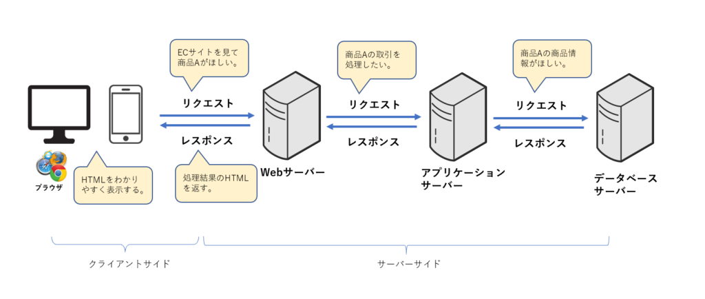 私たちがPCやスマホからWebサイトへアクセスする場合、以下のようなルートでインターネットにあるサーバーにやりたいことをリクエストしています。例えば、アマゾンのようなECサイトで商品Aを買いたいというケースでは、Webサーバーにリクエストを投げると、その裏で必要な処理を別のサーバーで実行、その結果をWebサーバーが受け取って、処理結果のHTMLをユーザーのPCやスマホに返すイメージです。ユーザー側ではPCやスマホにブラウザというソフトウェアが入っており、HTHLをわかりやすく表示するというプロセスです。
