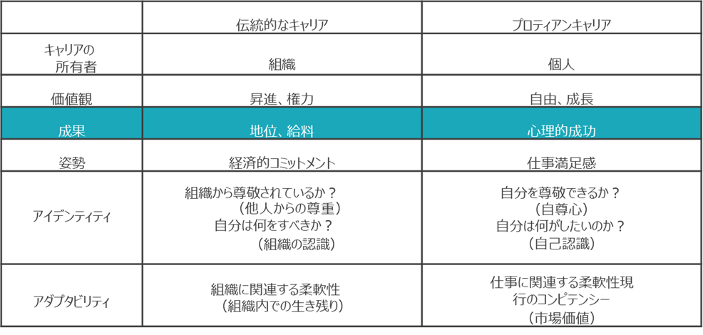 しかし、新しいキャリア観としてのプロティアン・キャリアでは個人の「心理的成功」をキャリアの成功と捉えます。